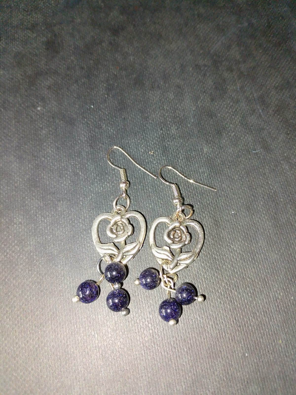Chaque boucle se compose d’un cœur métallique argenté finement ajouré, abritant en son centre une rose délicate. Symbole d’amour éternel et de beauté intemporelle. De la pointe du cœur pendent trois perles de blue sand (également appelée pierre sable étoilé), diffusant de subtils reflets bleutés et pailletés, semblables à un ciel étoilé.