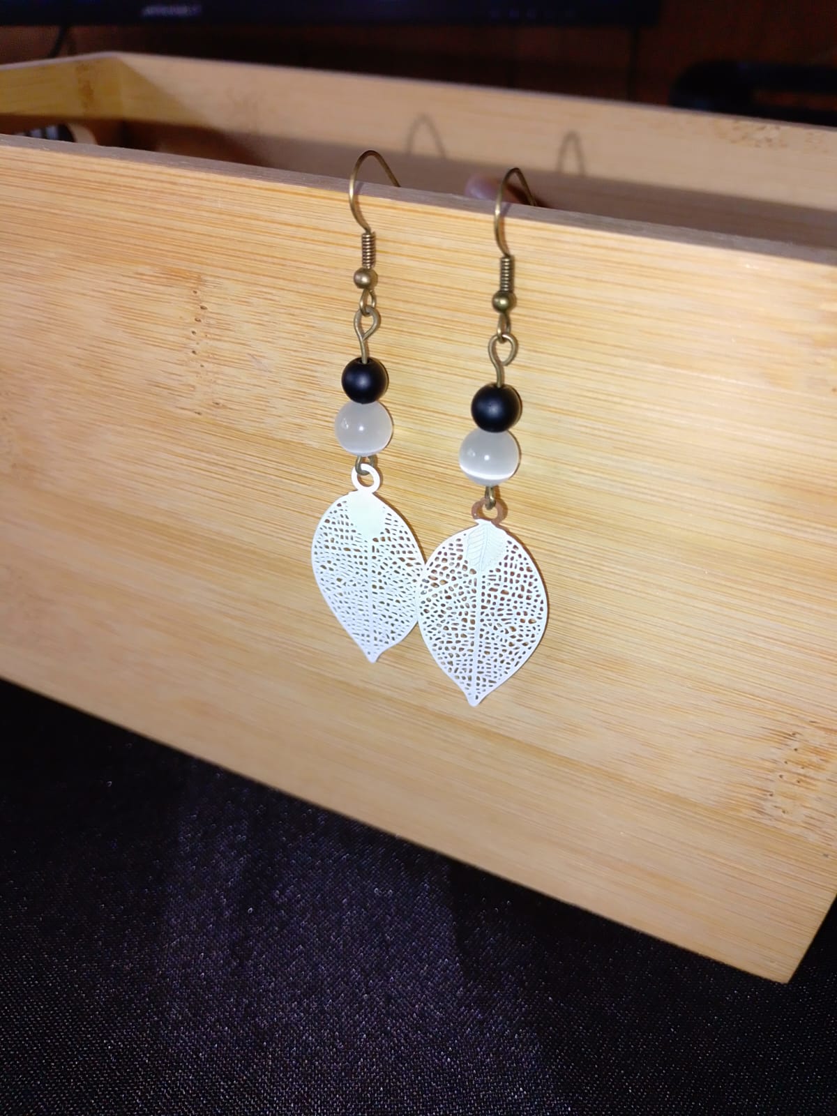 Opale | Agate noire mate | Feuille métallique blanche | crochets acier inoxydable