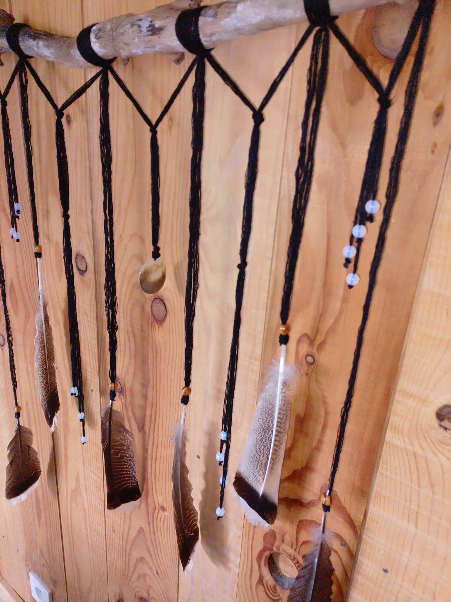 L’Œil de Lune est une suspension énergétique murale unique. Tissé de laine noire sur une branche naturelle, il réunit une nacre centrale, opales, perles de pin et plumes de dinde sauvage. Un talisman naturel pensé pour purifier, protéger et harmoniser l’énergie d’un espace.
