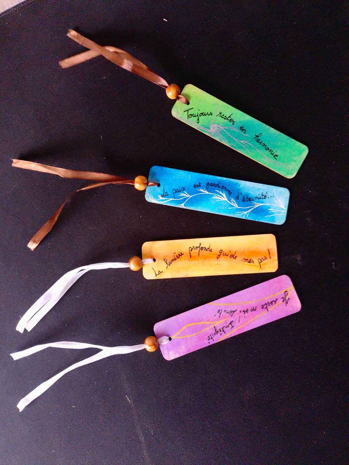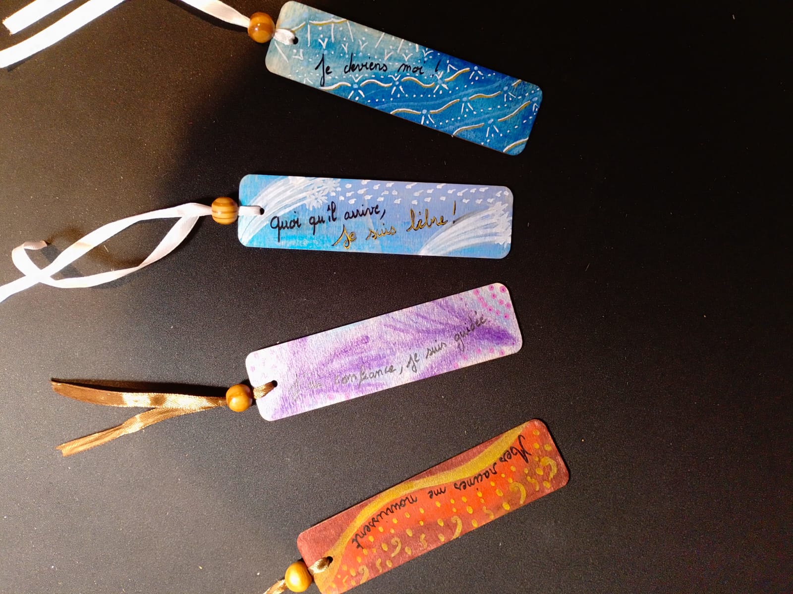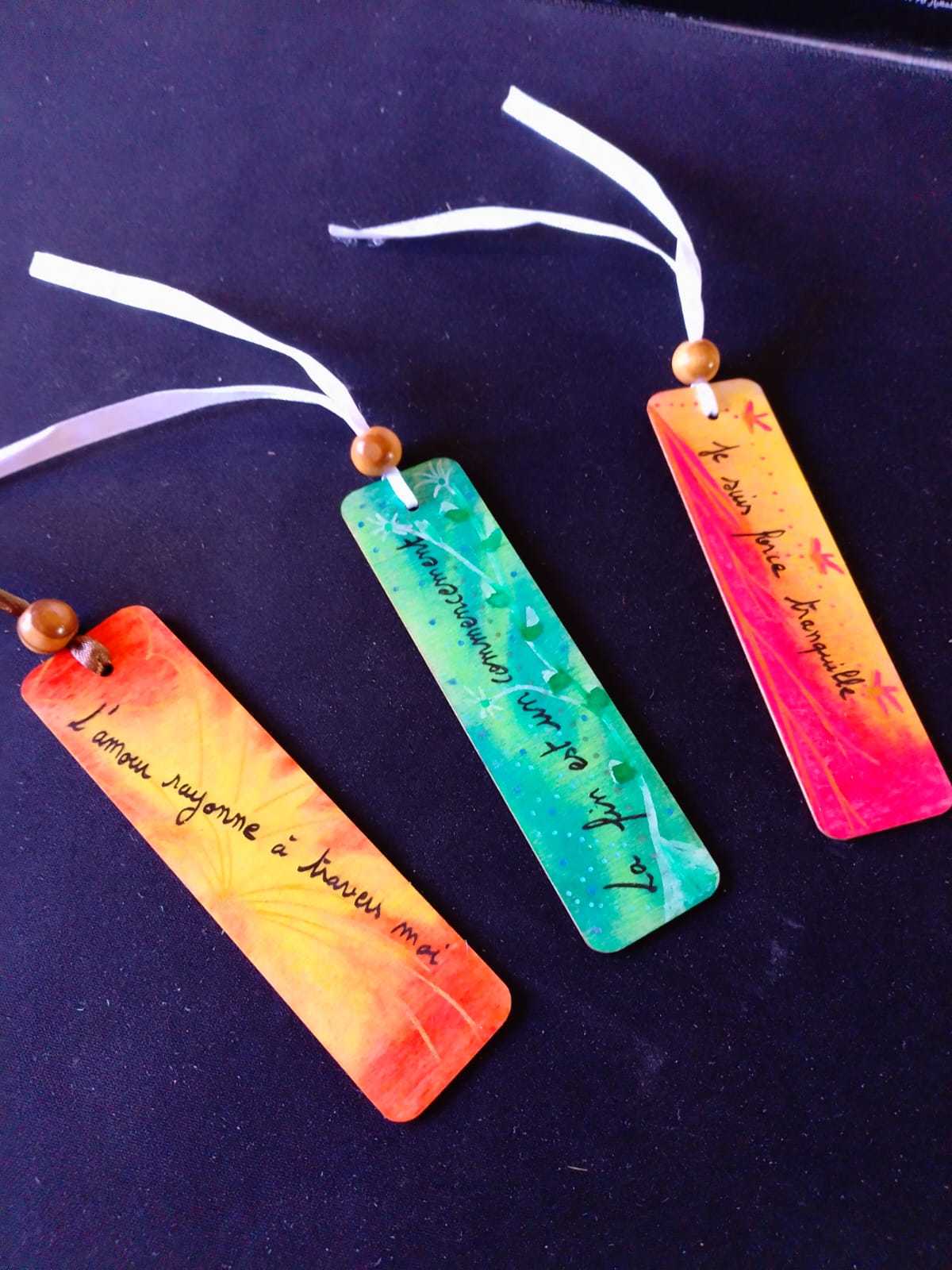 Élégamment décoré d’un ruban de satin et d’une perle en bois de pin, chaque marque-page devient à la fois un compagnon de lecture et un rappel d’intention vibratoire.
