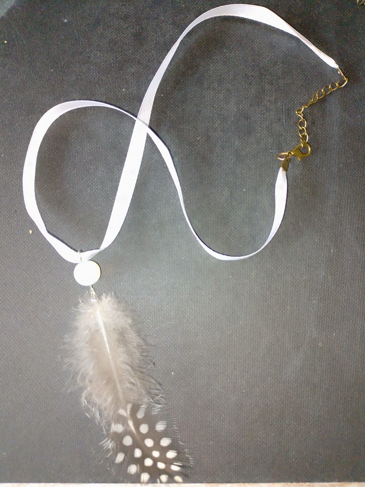 Ce bijou unique marie la légèreté d’une plume de pintade naturelle à la pureté irisée d’une perle d’opale, le tout suspendu à un ruban de satin blanc au toucher soyeux.
